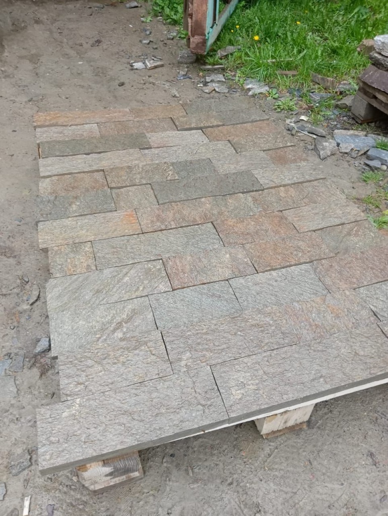 - необработанные плитки толщиной - 1,5-3 см. - по 30м2 на 1 поддоне - применяется в для облицовки вертикальных поверхностей, плитки от 2 до 3 см., благодаря цельной структуре и прочности камня, также можно применять для мощения дорожек, но только на бетонное основание.